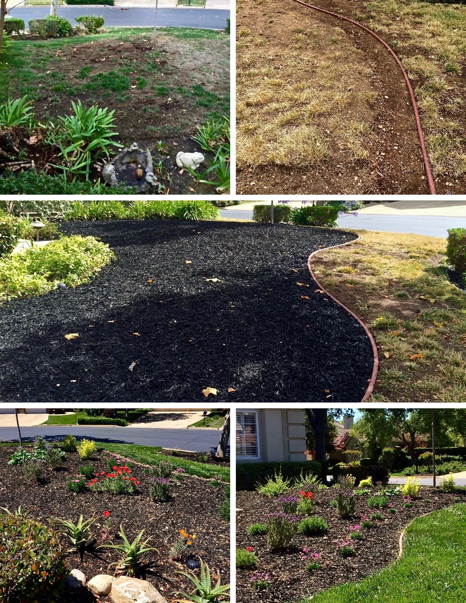 During the California mandatory water use reductions in 2015, many existing landscapes withered and died - including the large lawn on this property. Instead of completely eliminating a lawn, the lawn size was drastically reduced and strategically placed at the bottom of slopes (naturally collecting and slowing water runoff). The newly cleared area was planted with a variety of native species to California and similar horticultural selections. The finishing touch is a thick layer of high contrast wooden mulch. Mulch prevents water runoff, evaporation, and enhances soil quality as it breaks down.